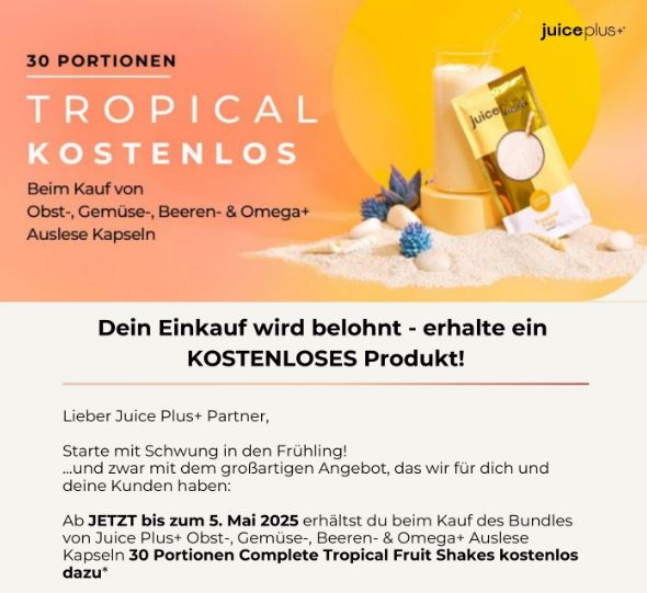Die kostenlosen 30 Portionen Complete Tropical Fruit Shakes werden mit deinerBestellung der oben genannten Produkte versandt.